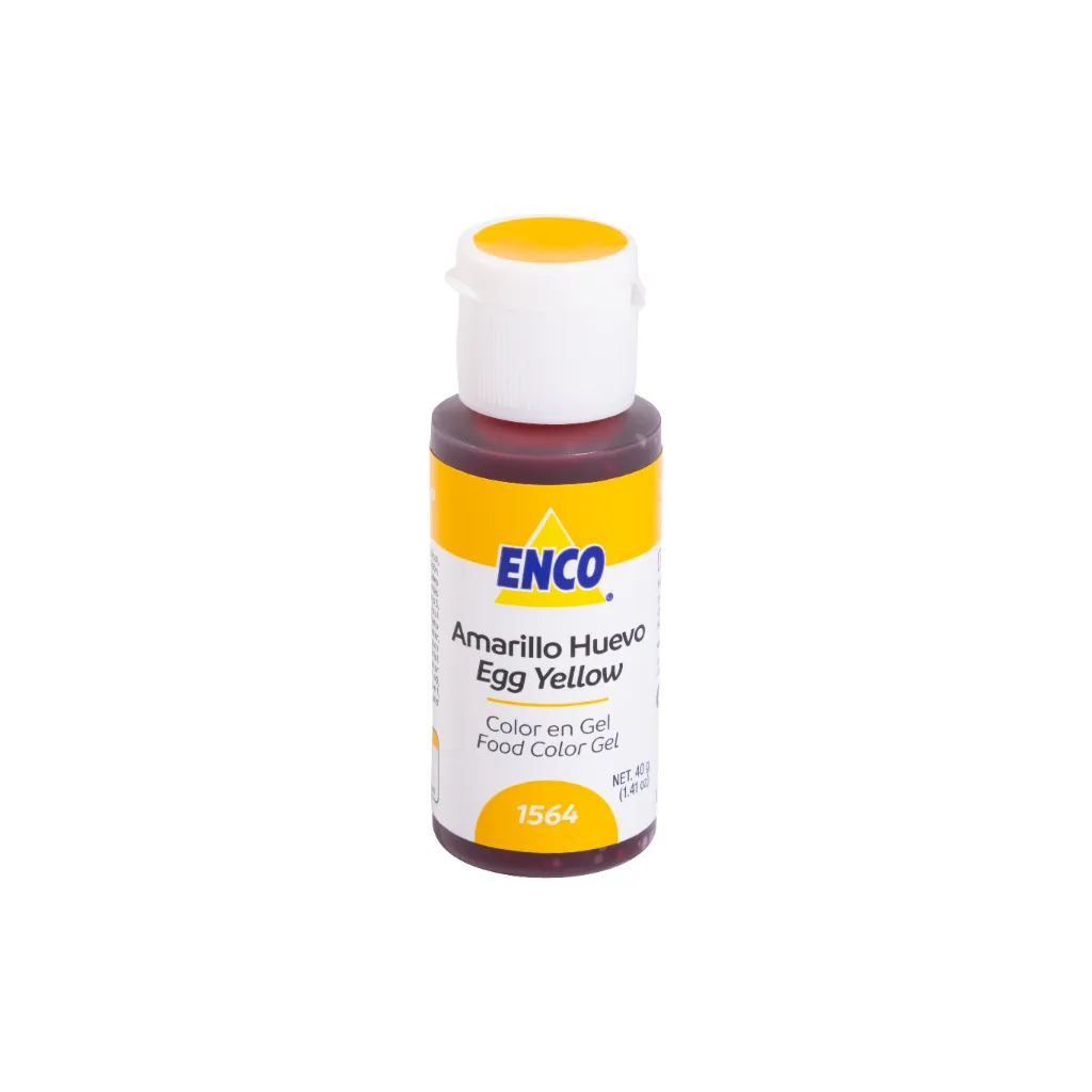 Colorante en gel ENCO Amarillo Huevo de alta concentración, ideal para lograr tonos amarillos cálidos, naturales y uniformes sin alterar sabor ni textura. Recomendado para fondant, buttercream, royal icing, merengue y crema chantilly. Disponible en 20 g y 40 g, con excelente rendimiento para uso profesional.