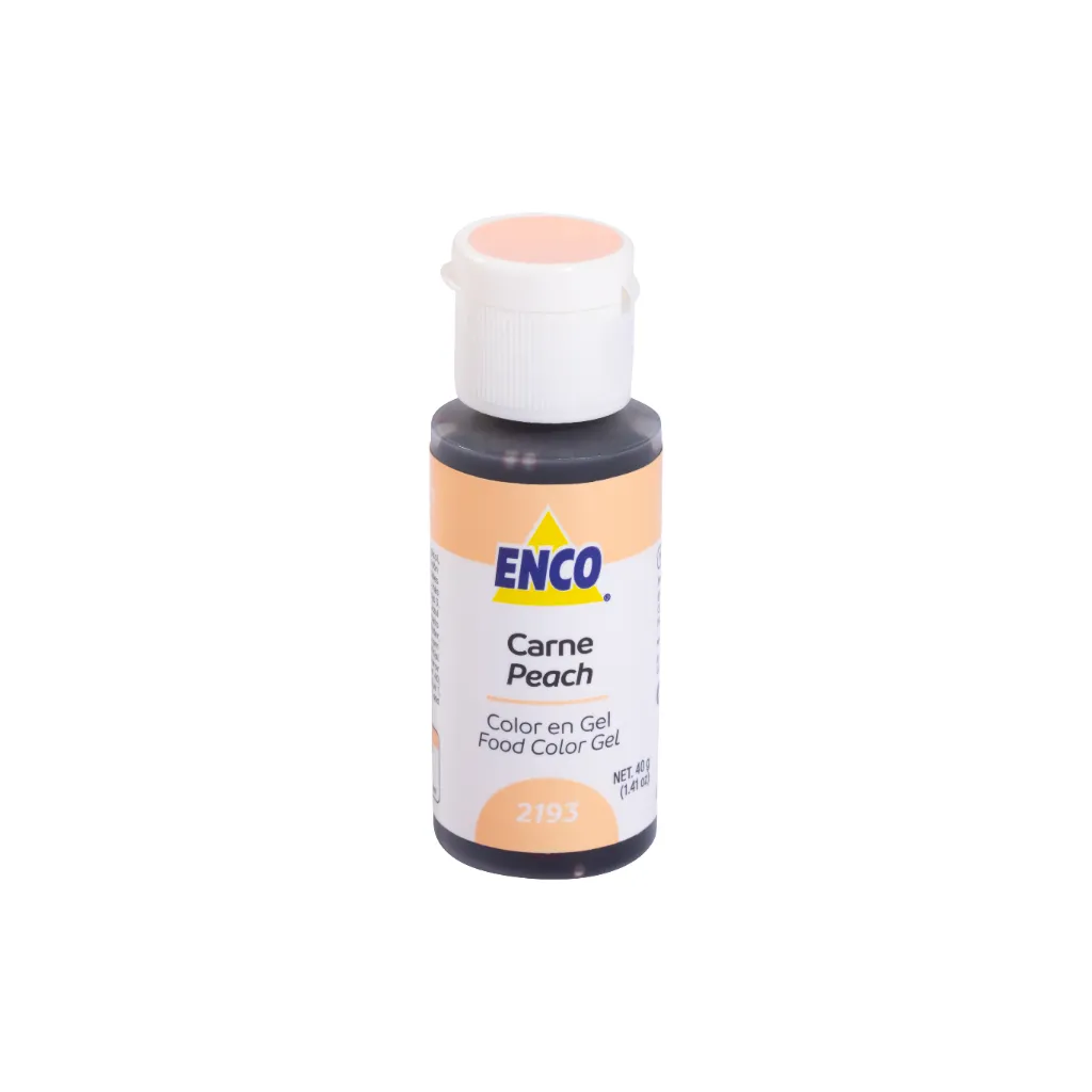 Colorante en gel ENCO Carne de alta concentración, ideal para obtener tonos piel naturales, suaves y uniformes sin alterar sabor ni textura. Perfecto para fondant, modelado, buttercream, royal icing y crema chantilly. Disponible en presentación de 40 g, con excelente rendimiento profesional.