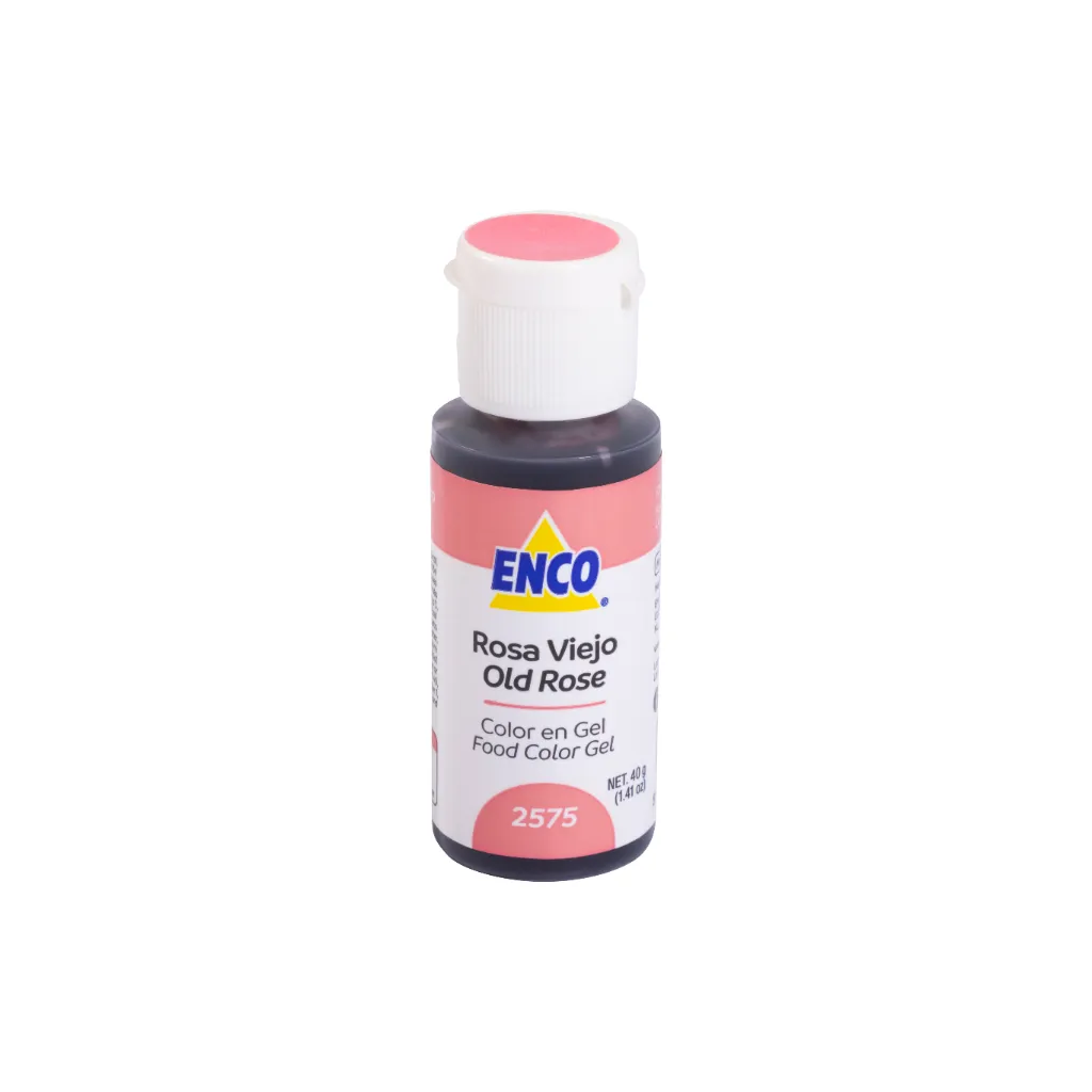 Colorante en gel ENCO Rosa Viejo de alta concentración, ideal para lograr tonos rosa apagados, elegantes y uniformes sin alterar sabor ni textura. Perfecto para fondant, buttercream, royal icing, merengue y crema chantilly. Disponible en 40 g, con excelente rendimiento para uso profesional y B2B.